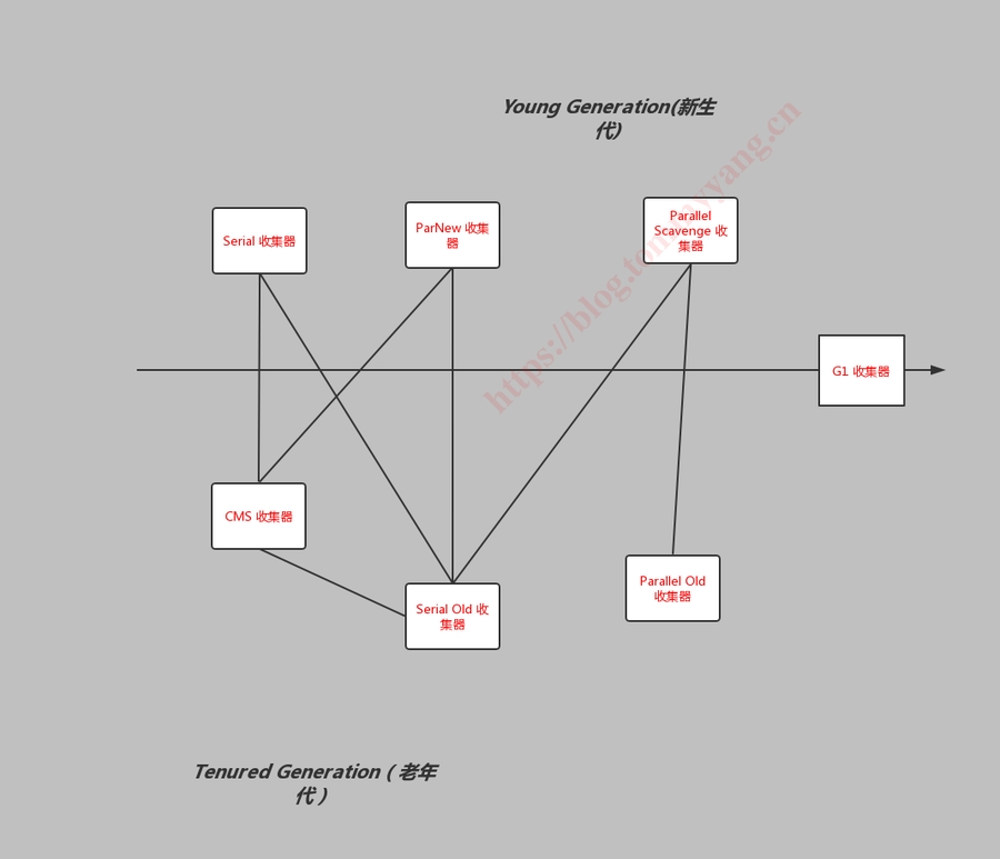 按收集器的回收对象以及收集器之间的联系,可以参照下图一: